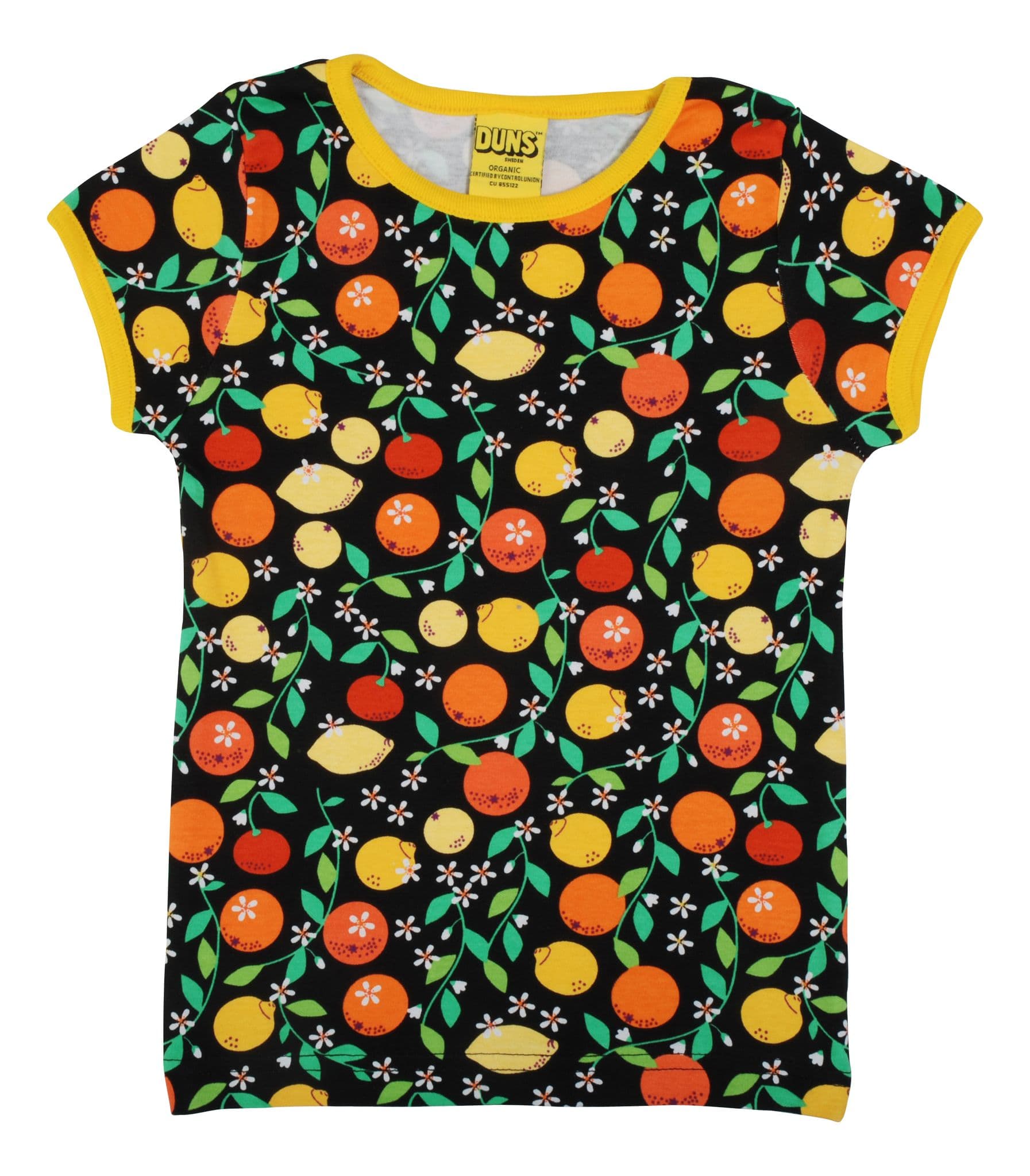 Duns Sweden printed top with short sleeves,in a black citrus print with contrast neck binding