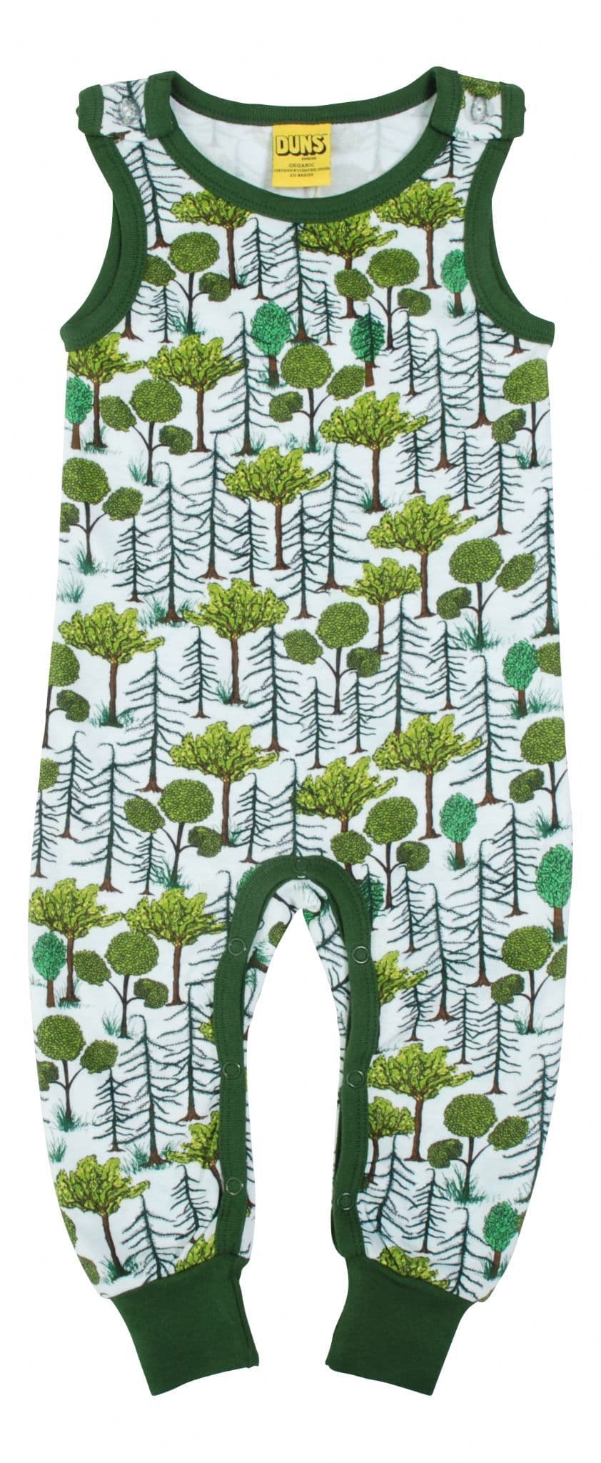 Duns Sweden Enchanted Forest dungarees with co-ordinating trim. Sizes up to 74 have press buttons at leg opening, made with 100% GOTS Certified Organic Cotton Interlock