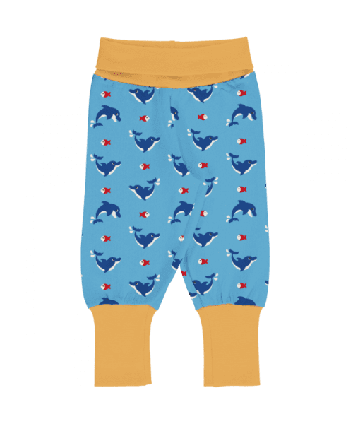Maxomorra Dolphin Print waist pants trousers in soft cotton jersey with ribbed folded waist and ankle cuffs.